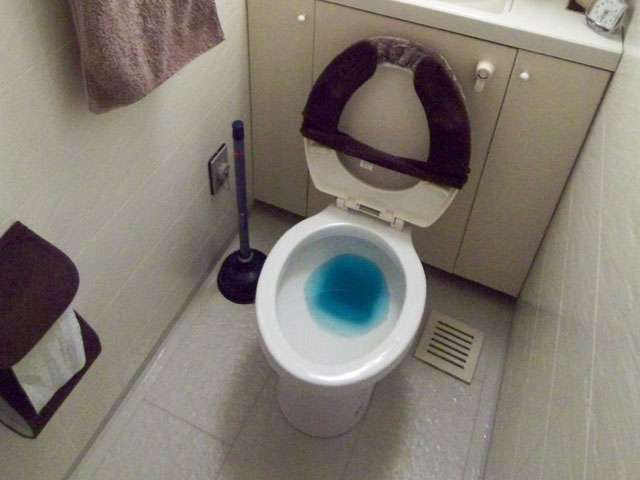 青い水が逆流してきて床が水浸しになってしまいました。