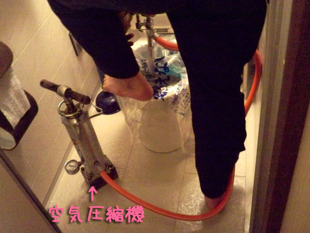 そして、おおきなゴムでトイレをふさぎ、その中に一気に圧をかけます。