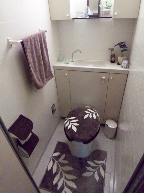 鏡には脱衣所に置かれた便器の蓋も見えますね。