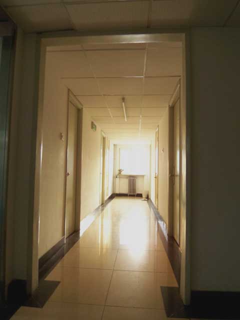 お湯を汲みに部屋の外へ出たら、寮の廊下が夕日で