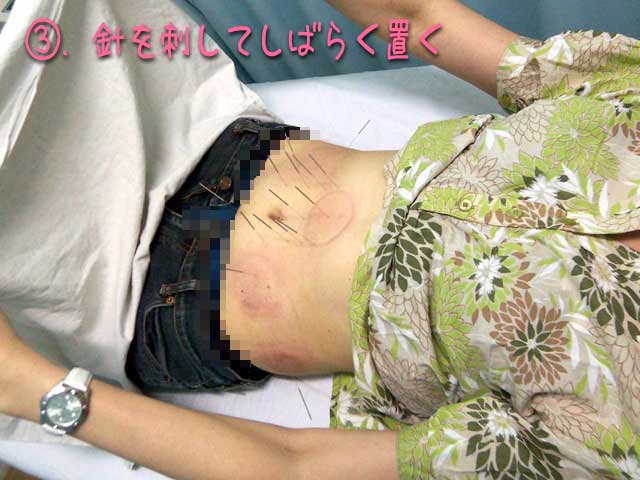 針はお腹だけでなく、腕や足にも刺さっています。このまま約20分間おきます。