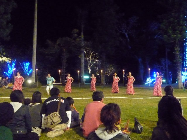 芝生の広場では、かがり火をバックに、フラダンスショーが始まりました。