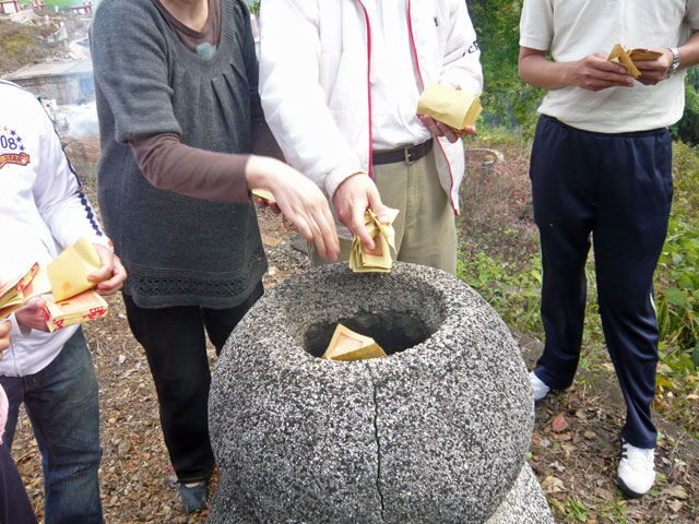お参りが終わると、紙のお金をお墓に並べて、石で重しをします。