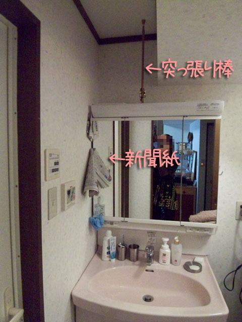 そして、横の隙間に新聞紙をかませ、上は突っ張り棒で固定する、という