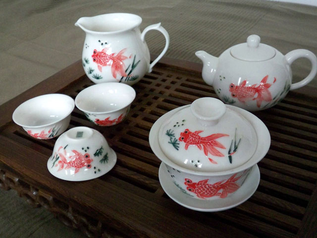 そして、こういう茶具を使って、実際にお茶を淹れる練習もします。